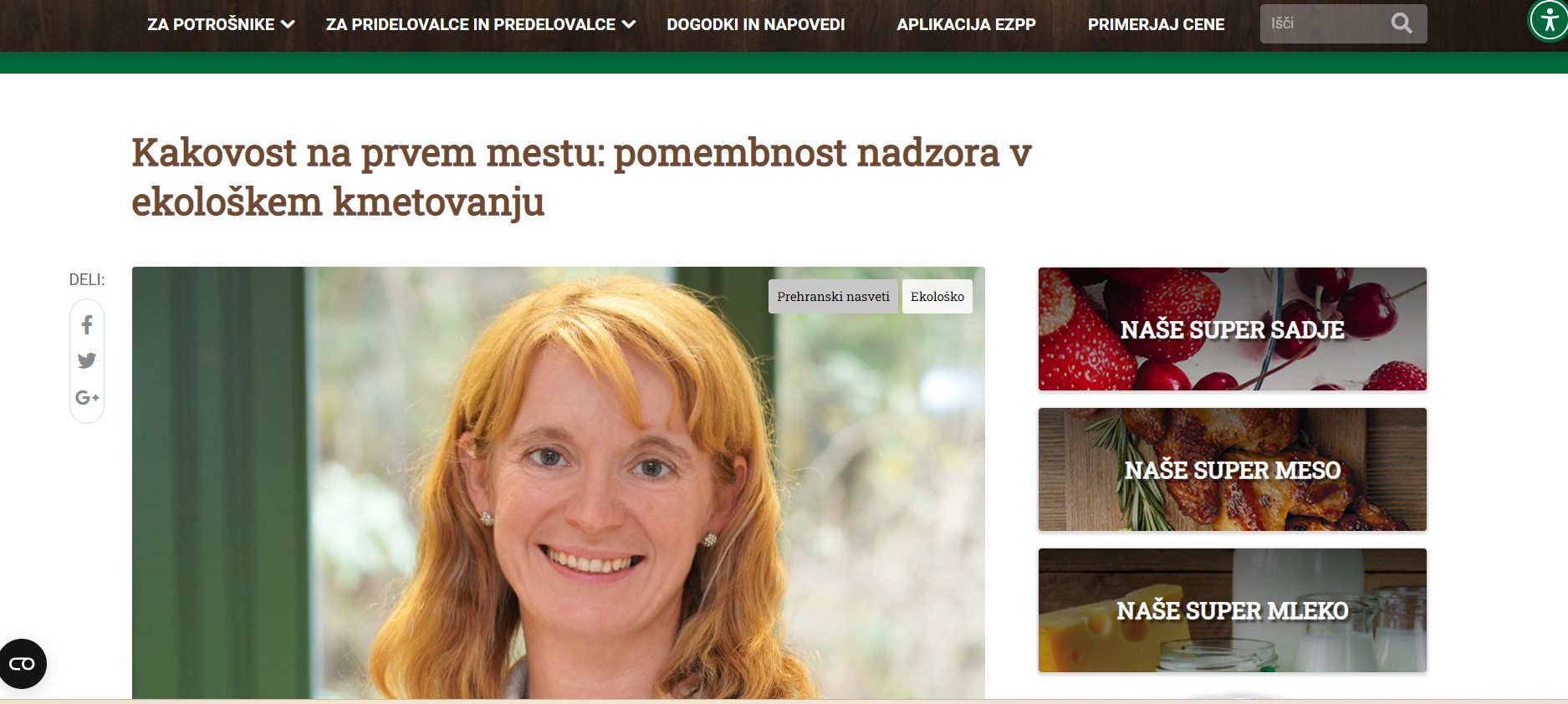 V članku na spodnji povezavi si lahko preberete o pomembnosti nadzora v ekološkem kmetijstvu. Z novinarsko ekipo portala Naša super hrana je govorila naša sodelavka Nives Adamič Kričaj, univ. dipl. ing. kmetijstva in koordinatorko certifikacijske enote za ekološko kmetijstvo – pridelavo/predelavo na IKC Inštitutu za kontrolo in certifikacijo Univerze v Mariboru.